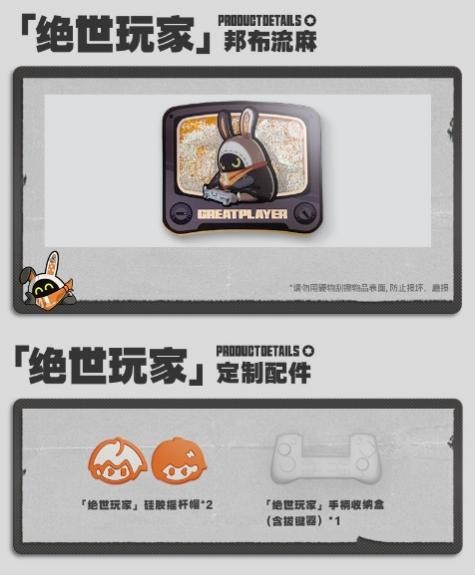 另外还有精美的「绝世玩家」邦布流麻和「绝世玩家」定制配件,这些配件包括摇杆硅胶帽和手柄收纳盒(含拔键器)。