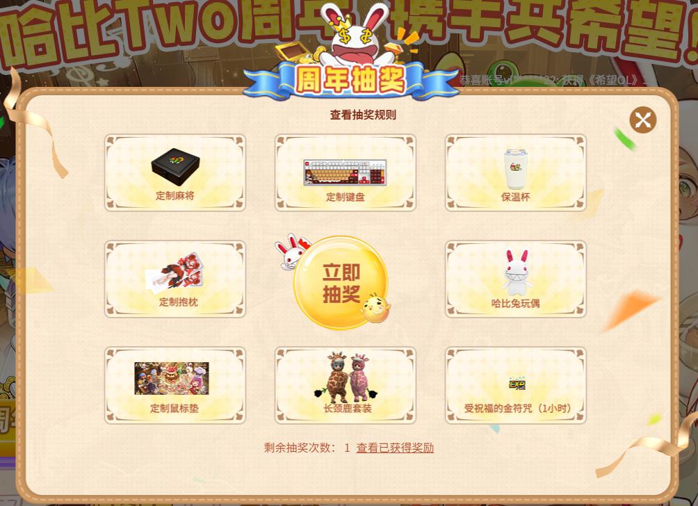 周年庆典抽奖活动已经上线,只需每日登录活动界面即可获得抽奖机会!精美游戏周边等你来赢:定制机械键盘、《希望OL》主题麻将套装、哈比兔玩偶、周年庆鼠标垫……转动转盘,让幸运为你的冒险之旅增添更多惊喜!每日坚持登录,收获不一样的幸运礼物。