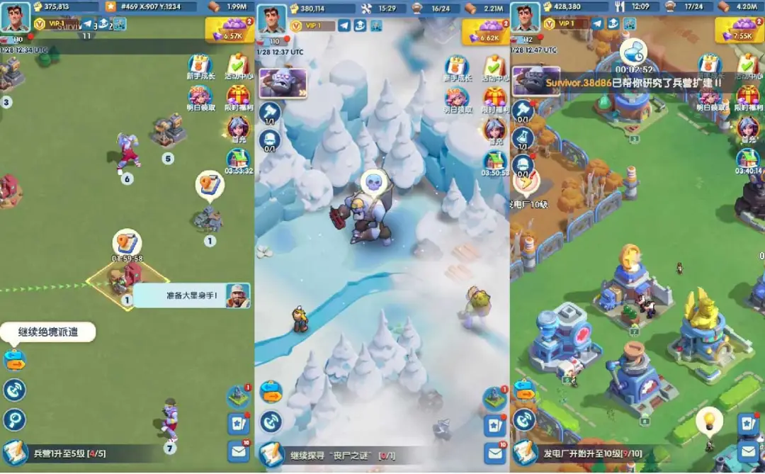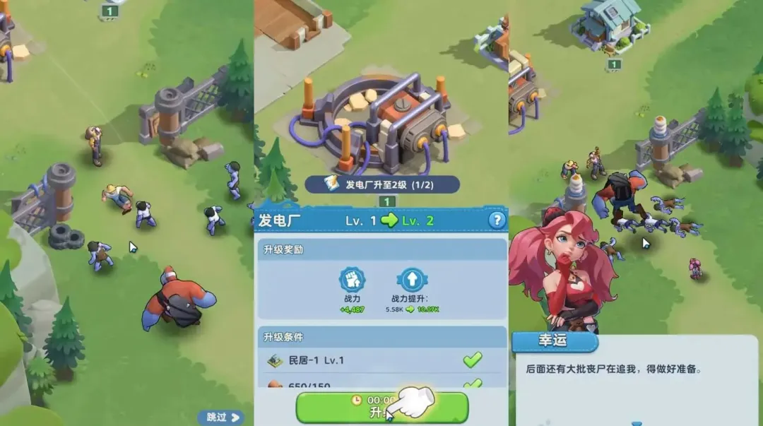 前期的经营体验做得很轻量,幸存者可以一键自动干活,不用玩家在那儿一个个手动安排。建筑升级的时候有动画反馈,居民偶尔还会做个伸懒腰之类的小动作。这种设计怎么说呢,就是让你玩起来不累,不会陷入那种数值焦虑。