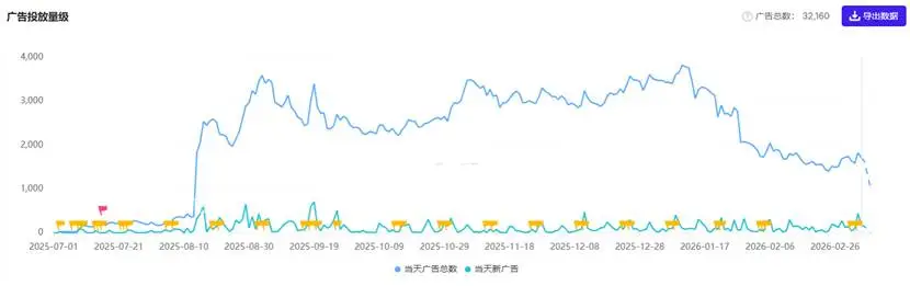 产品能爆,买量策略功不可没。AppGrowing的数据显示,《Tiles Survive!》在2024年8月下旬明显加大了投放力度,日均广告数量从300组直接拉到2000组以上。从上线到现在,累计投放的素材总数已经超过2.6万组。